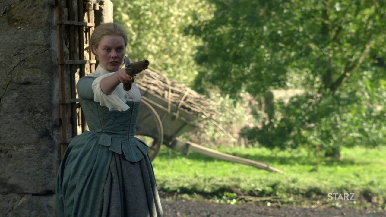 ¡Un momento! ¿Pero tendrá valor la bruja de denunciar a Jamie cuando ella casi lo mata? Pues sí, valor tiene y también poca cabeza porque tras Culloden el uso de armas de fuego quedó prohibido con lo que o dice que le escupió perdigones con la boca a una velocidad sobrehumana o Jamie puede delatarla por tener armas de fuego y...